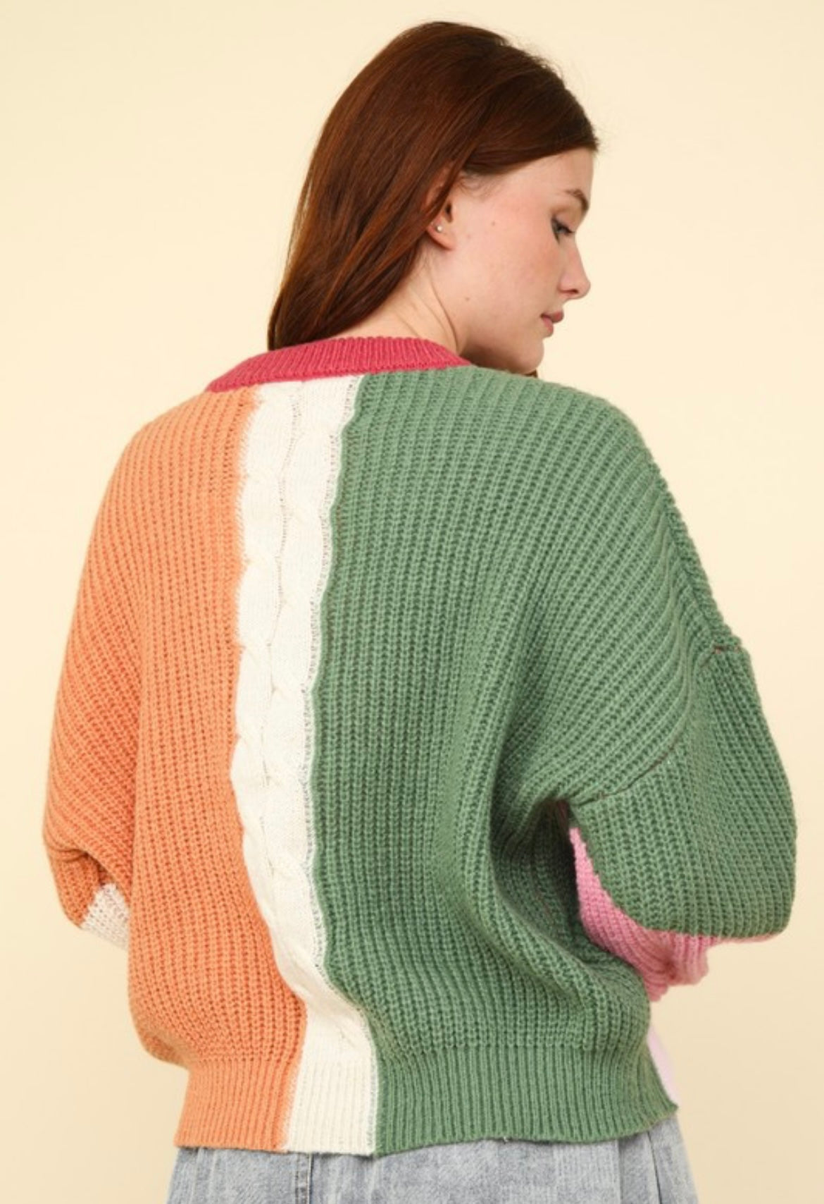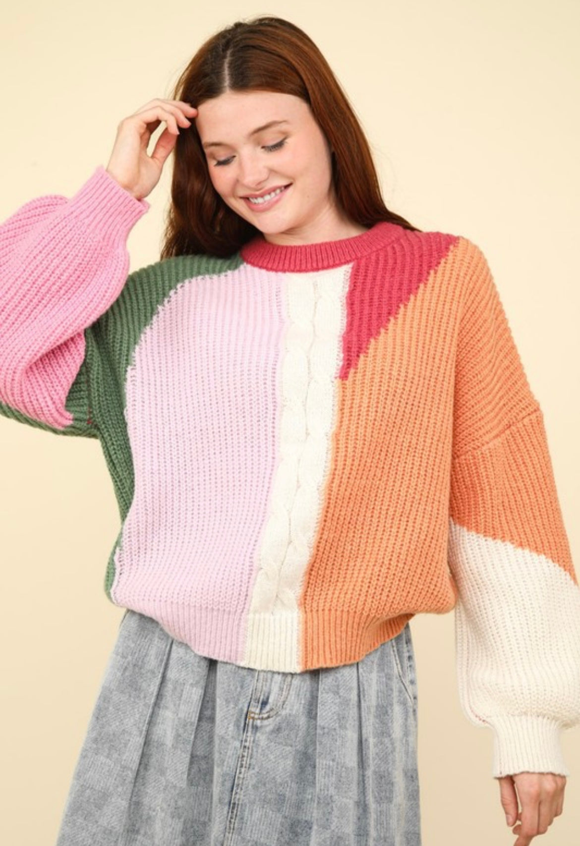 We're loving the color combo of our A Perfect Combo sweater. It pairs great with all shades of denim, including white, but would look super cute styled with a dark denim flare.
