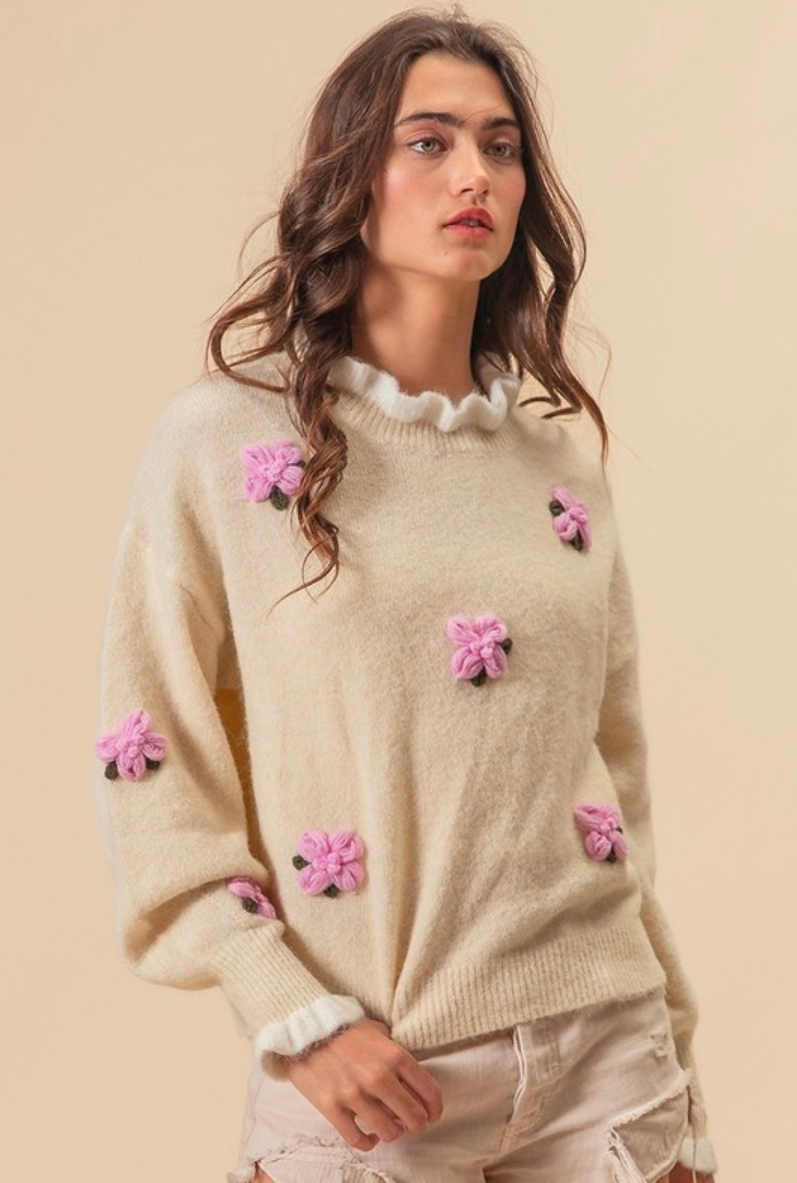 We're in our sweetie pie era and these pink crochet flowers are doing the most! So soft, stretchy, and we're loving the dainty lettuce trim neck and sleeve. This one if perfect for Spring! Relaxed fit, but if you prefer oversized, we'd suggest sizing up by one.